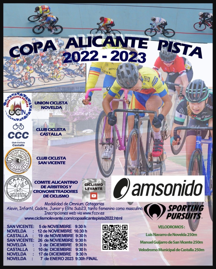 La Copa de Alicante de Pista 2022 AM Sonido-Sporting Pursuits contará con una prueba más. Comenzará en el Velódromo de San Vicente del próximo 5 de noviembre y finalizará el 7 de enero, y no el 17 de diciembre, como en principio estaba previsto, en Novelda. La Unión Ciclista Novelda, el CC Castalla y el CC San Vicente han diseñado, con el apoyo del Comité Alicantino de Árbitros, un torneo que cuenta con ocho pruebas que se disputarán en los velódromos de las localidades de dichas entidades en la modalidad de Omnium (Scratch, Tempo, Eliminación y Puntuación). En ellas podrán participar todos los Alevines, Infantiles, Cadetes, Junior, Sub23, Elites y Masters, tanto masculino como femenino.