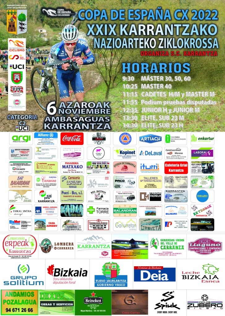 Llodio y Karrantza acogen este fin de semana la cuarta y quinta carrera de la Copa España de Ciclocross 2022. Felipe Orts, Raúl Mira y David Ivars son bajas ya que compiten en Namur en el Europeo con el maillot del combinado de España, mientras que Óscar Orts (GD Llopis), que es segundo en la categoría cadete, tras la disputa de tres pruebas, tampoco viajará a tierras vascas a pesar de estar inscrito. Los que sí estarán serán Luis Bernabéu (Esetec Pikolinos) y Vania Rico (Teika). A nivel de la Comunitat tampoco faltarán a la cita Sara Bonillo (Cx Sueca), como líder de la categoría sub 23, Héctor Calatayud (Triasport), Sofía Rodríguez (Nesta), Leyre Almena (Teika), Laia Canet (Triasport), Eric Igual (Teika), Pablo Machancoses (Triasport), Asier Ortega (Teika), Aroa Rodríguez (Triasport), Martí Bravo (CX Sueca), Pablo Calvo (Teika) y Anna Quintero (CX Sueca) y varios máster. Lista de inscritos.