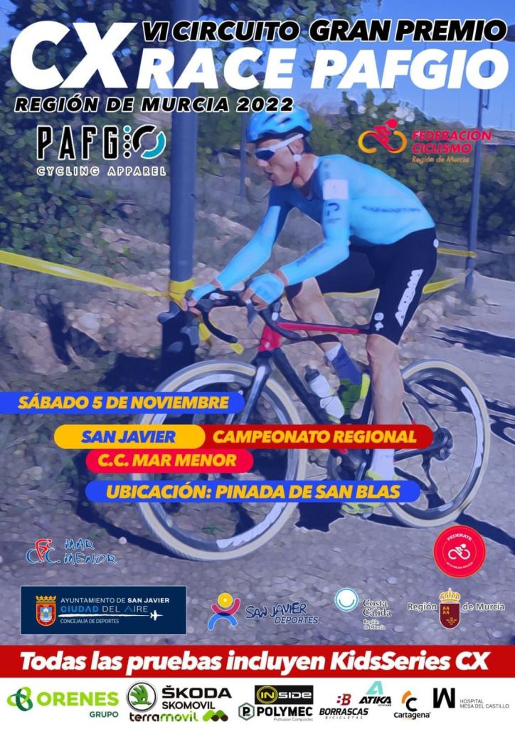 Este fin de semana San Javier y Alcantarilla celebran las segunda y tercera prueba del CX RACE GP PAFGIO Región de Murcia 2022. El sábado, a partir de las 10 horas, en la Pinada de San Blas de San Javier, volverá la competición tras el inicio vivido la pasada semana en Las Torrres de Cotillas. Ya, el domingo, a las 11.30 horas, se correrá en Alcantarilla. En ambas carreras habrá pruebas Kids Series para los más pequeños. Destacar la presencia de un buen número de ciclista de la provincia. Antonio Guirao (Élites), Marc Moncho (Cadetes) y Claudia Pérez (Júniors) afrontan la competición de San Javier como líderes.