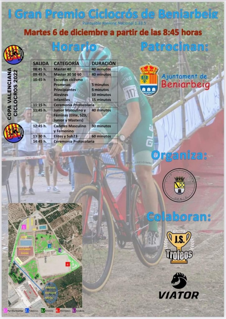 El I Gran Premio Ciclocross de Beniarbeig previsto para el día 6 de diciembre, prueba de la Copa Valenciana de CX, ya cuenta con su cartel. La organización ha comenzado a diseñar lo que será una fiesta de ciclismo. El proyecto va a ser posible gracias a mucha gente y entre los colaboradores más implicados figuran el Ayuntamiento de Beniarbeig, el Club Ciclista Dénia, además de Excavaciones y Desmontes Pistola, S. L. y otras firmas locales.