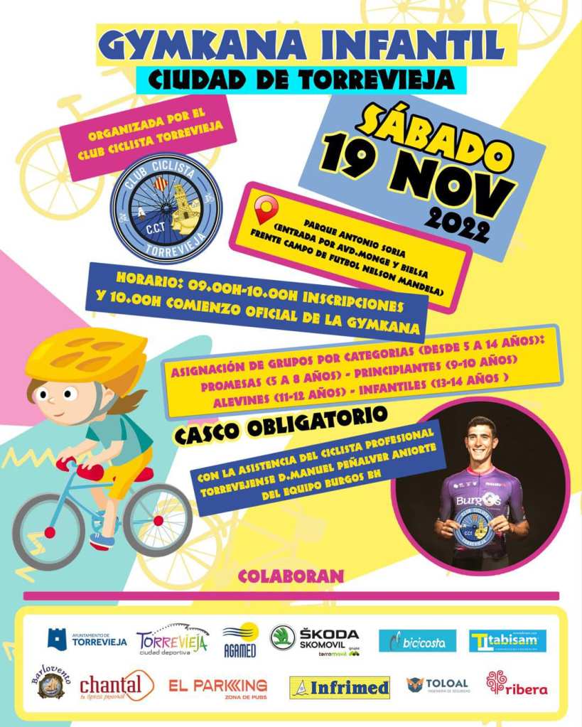 El sábado, día 19 de noviembre, se disputará la Gymkana Infantil «Ciudad de Torrevieja» en el parque Antonio Soria. La prueba, organizada por el Ayuntamiento de Torrevieja y el Club Ciclista Torrevieja, está abierta a los niños entre los 5 y los 14 años. Dará comienzo a las 10 horas y contará con la presencia con el ciclista profesional local Manuel Peñalver. «Os espero a todos los peques el sábado, porque vamos a pasárnoslo muy bien», dice el corredor del Burgos BH.