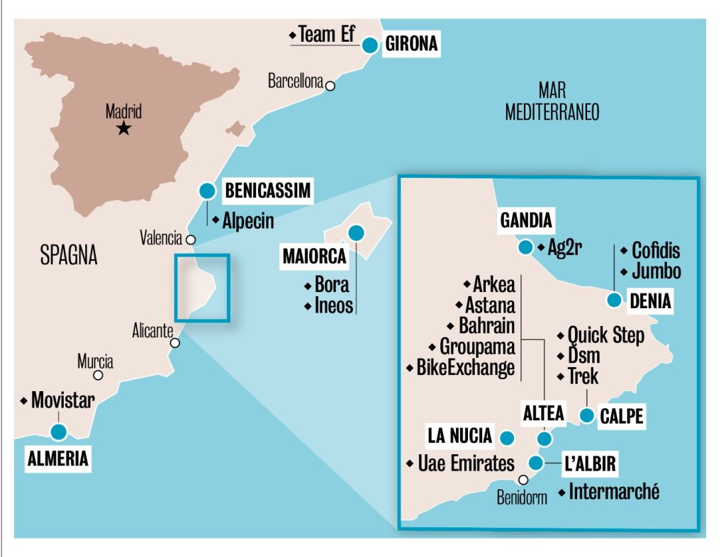El diario deportivo italiano La Gazzeta dello Sport se hace eco en sus páginas, en un reportaje firmado por Ciro Scognamiglio, que serán 18 las escuadras World Tour las que se concentrarán en España en diciembre para preparar la temporada 2023 a lo largo de la costa del mar Mediterráneo, desde Almería a Girona, además de en Mallorca. Doce de ellos lo harán en la provincia de Alicante, lo que demuestra que la Costa Blanca resulta muy atractiva tanto por el clima como por los recorridos que se pueden realizar por el interior de Alicante. Hay que reseñar que son ya muchos los corredores a titulo personal los que están concentrados en la zona como Mathieu Van der Poel y Remco Evenepoel.