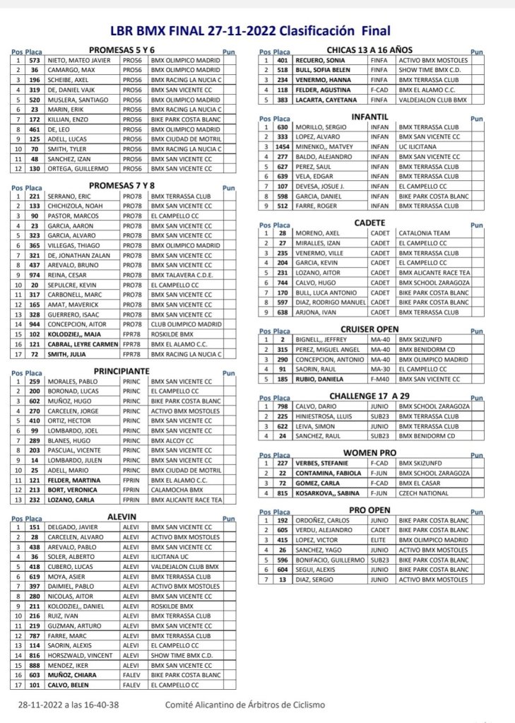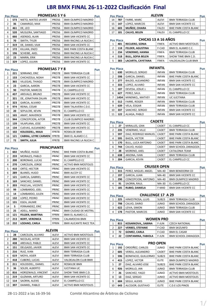 Los ganadores han sido: Javier Nieto (Olímpico), en Promesas 5 y 6, los dos días; Eric Serrano (Terrassa), en Promesas 7 y 8, tanto el sábado como el domingo; Hugo Muñoz (Bike Park Costa Blanca) venció el primer día y Pablo Morales (BMX San Vicente), el segundo, en Principiantes; Álvaro Carcelén (Activo), el sábado, y Javier Delgado (BMX San Vicente), el domingo, en Alevines; Sonia Recuero (Activo), en ambas jornadas, en chicas 13 a 16 años; Sergio Morillo (Terrassa), también los dos días, en Infantiles; Izán Miralles (El Campello) y Axel Moreno (Catalonia), en Cadetes; Ángel Pérez (Benidorm) y Jeffrey Bignell (Skizunfd), en Cruiser Open; Lluis Hiniestrosa (Terrassa) y Darío Calvo (School), en Challenge 17 a 29; Sabina Korsakova (Czech National) y Stefanie Verbes (Skizunfd) , en Women Pro; y Carlos Ordóñez (Bike Park Costa Blanca), en Pro Open.