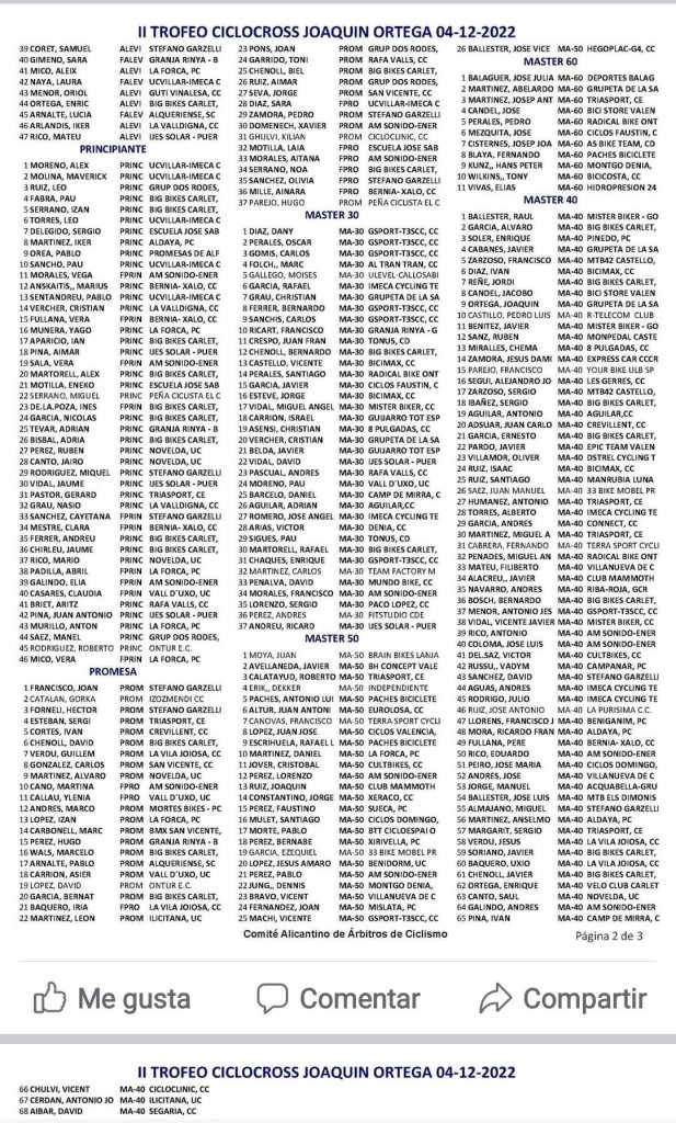 Dany Díaz (Gsport) ha sido el mejor M30; en M40, Sabrina Cerdá (BH Concept) y Raúl Ballester (Mister Biker) fueron los vencedores; Roser Vidal (Biking Turia) y Juan Moya (Brain) vencdieron en M50; y José Juliá Balaguer (Deportes Balag) en M60.