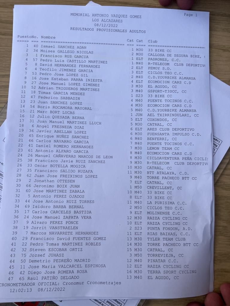 Francisco Rus ha sido el primer élite; Tomás García (33 Bike) se ha impuesto en sub 23; Ismael Sánchez, en M30; Pedro Luis Castillo (Telecom), en M40; Jerónimo Boix ( Crevillent), en M50; y Marc Bort (AEL Txirrindulari), en júniors.