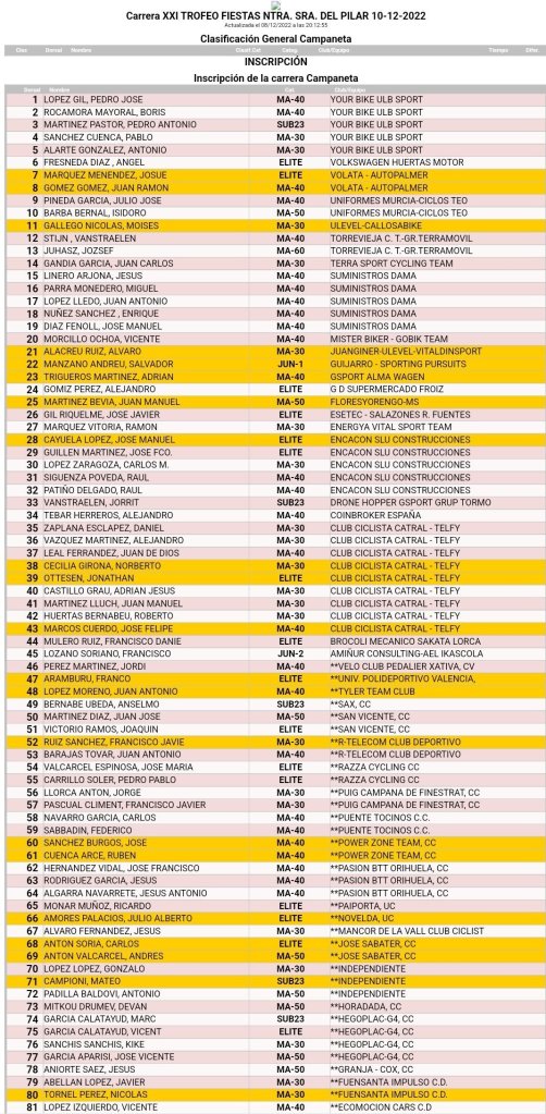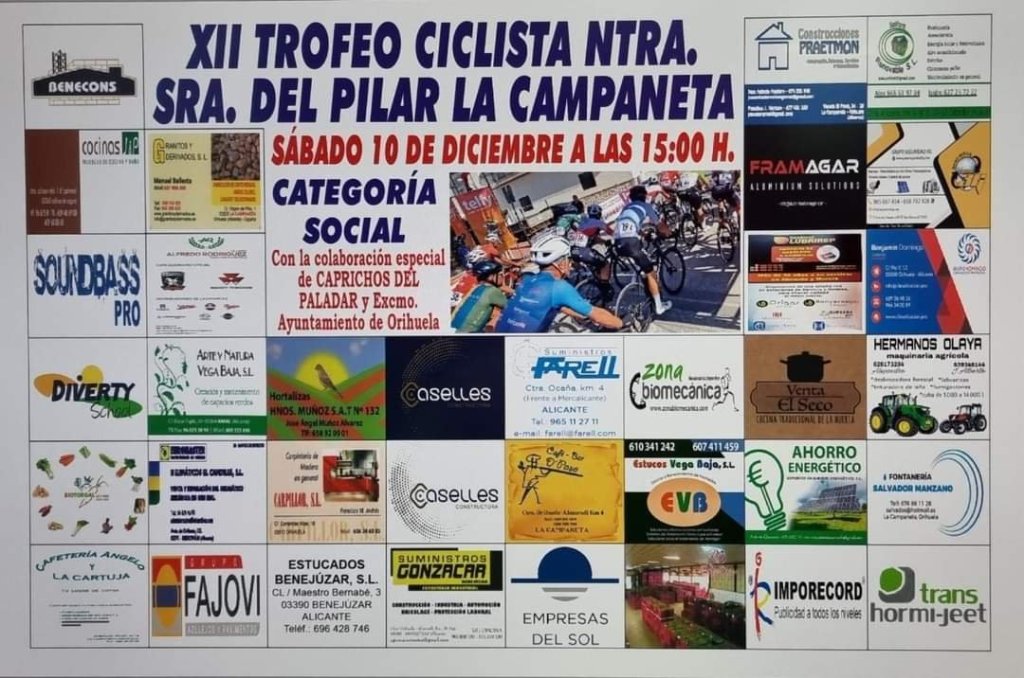 Fin de semana intenso para el ciclismo amateur. Este fin de semana se disputan dos pruebas de la categoría social en la provincia de Alicante. El XII Trofeo Fiestas Nuestra Señora Virgen del Pilar se correrá el 10 de diciembre en La Campaneta-Orihuela, contará con 72 kilómetros y comenzará a las 15 horas. Un total de 106 ciclistas se han inscritos: Élites (22), Sub 23 (5), Máster 30 (29), Máster 40 (36), Máster 50 (10), Máster 60 (1), Féminas Máster 50 (1), Júnior de primer año (1) y Júnior de segundo (2).