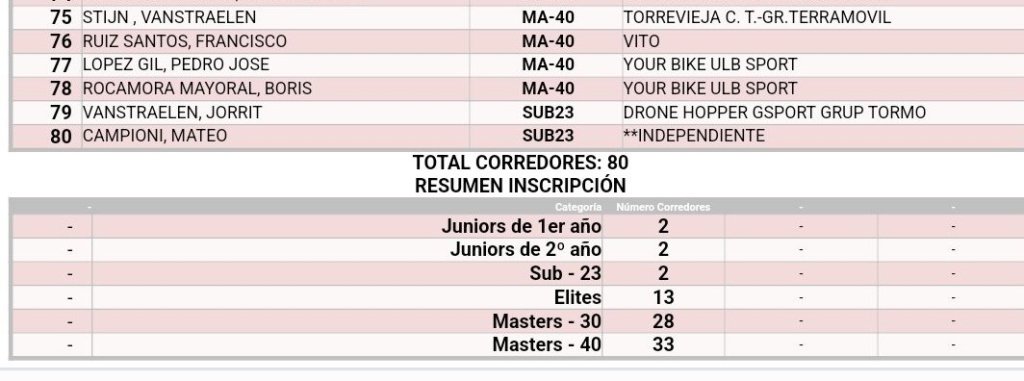 Segunda Manga: 10.30h – 12.00h – Junior, Élite, Sub23, M30, M40 (15 Vueltas – 62.4 kms).