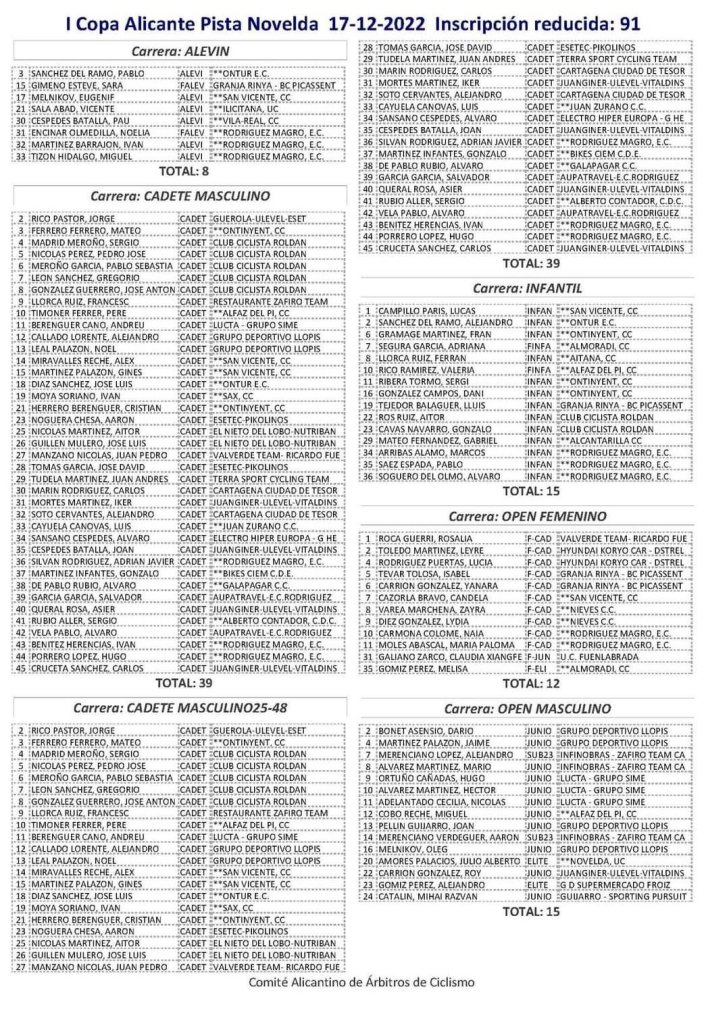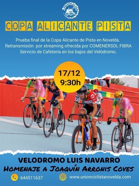 Novelda recibe el sábado, día 17 de diciembre, la cita final de la Copa de Alicante de Pista 2022 AM Sonido-Sporting Pursuits. La cita servirá de homenaje a Joaquín Arronis Coves, comisario de cclismo, con casi 30 años de servicio en la provincia. Un bonito detalle a una persona que ha sido historia dentro del deporte del pedal. Se espera que el tiempo permita disfrutar de una gran competición de Ómnium que despide la primera edición de la Copa que ha sido diseñada por la Unión Ciclista Novelda, el CC Castalla y el CC San Vicente con el apoyo del Comité Alicantino de Árbitros. Participarán 91 ciclistas. La competición será ofrecida en directo por Streaming gracias a Comenersol Fibra.