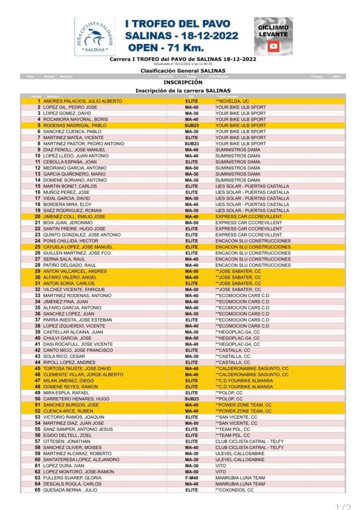 El domingo, Salinas celebra a partir de las 10.30 horas, el I Trofeo del Pavo que contará de 70,5 kilómetros. Se darán cinco vueltas a un circuito. El plazo de inscripción se cerró con 99 participantes, aunque antes de la salida se permite a los retrasados adquirir su dorsal, de 8:30 a 10:00 horas en CA BYRON RESTOBAR (Avda La Libertad 1).