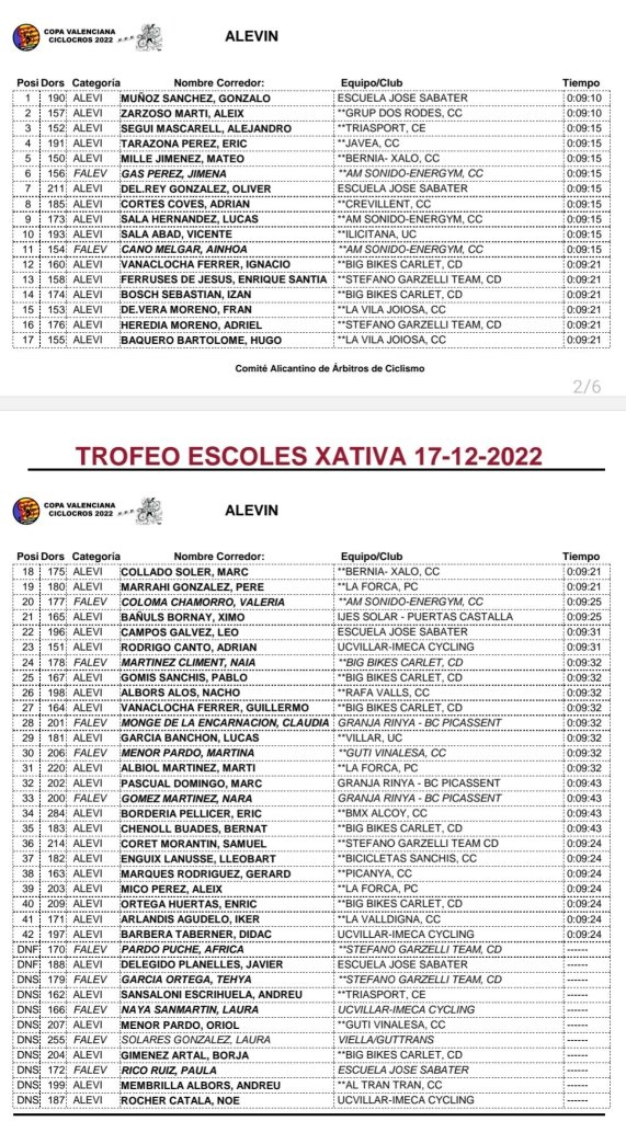 Hoy se ha disputado en Xàtiva la penúltima prueba de Escuelas de la Copa Valenciana de CX 2022. Los ganadores del «Ciutad de Xàtiva han sido: Vicent Andrés (La Forca) y Carla Bañuls (Triasport) se han impuesto en Infantiles; Gonzalo Muñoz (Sabater) y Jimena Gas (AM Sonido), en Alevines; Álex Moreno (UC Villar) y Vera Fullana (Bernia Xaló), en Principiantes; y Joan Francisco (Stefano Garzelli) y Martina Cano (AM Sonido), en Promesas.