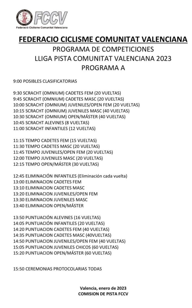 El domingo, día 8 de enero, se inicia en el velódromo de Borriana la primera prueba de la Lliga de Pista de la Comunitat Valenciana 2023. El Trofeu Ajuntament de Borriana comenzará a las nueve de la mañana.