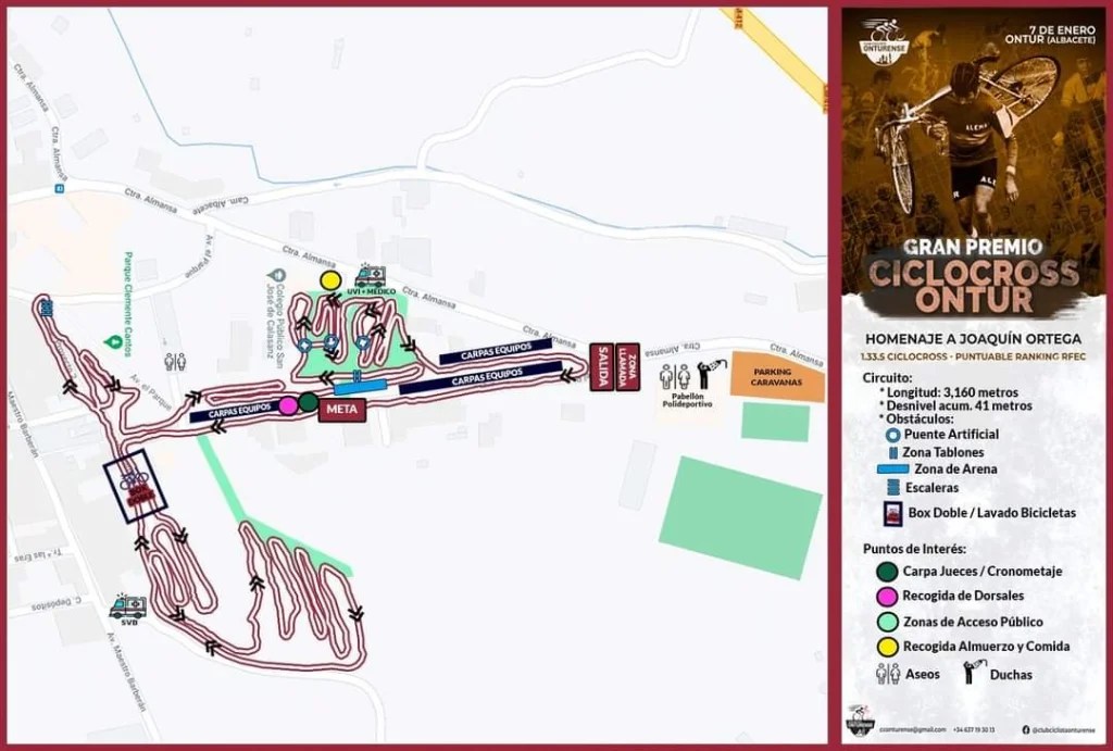 El Club Ciclista Onturense ha diseñado un circuito de 3,1 kilómetros y un desnivel acumulado de 41 metros, ubicado en la Avenida del Parque, una zona anexa a la localidad. Un recorrido entretenido, dotado de elementos técnicos como puentes, escalera, zona de arena, tablones, ziz-zag y cuarenta curvas, que pondrán a prueba la pericia de los mejores ciclocrosistas de la parrilla regional y nacional. El Gran Premio Ciclocross Ontur está dirigido a todas las categorías, desde cadetes hasta máster 60, y contará con una competición para Escuelas.