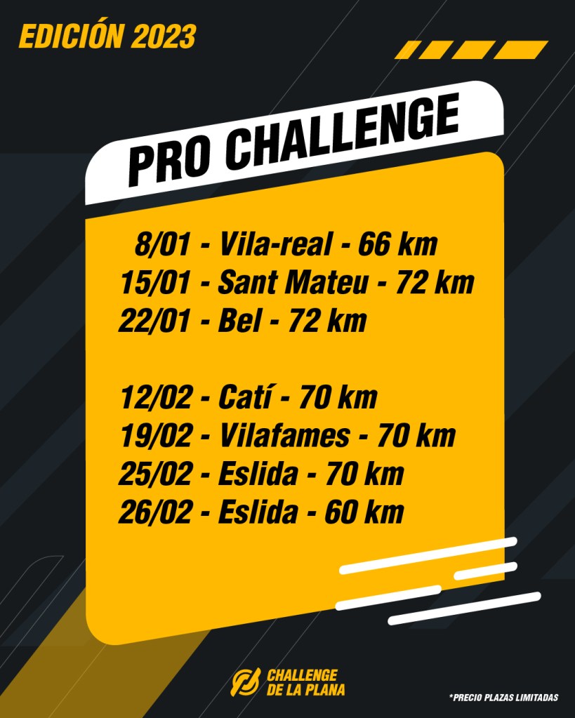 Vila-Real dará el domingo el banderazo de salida a una nueva edición de la Challenge de la Plana. La primera etapa contará con 66 kilómetros. La competición cuenta con seis jornadas. Tras la de Vila-Real llegarán las de Sant Mateu (15-1-2023 – 72 Kilómetros), Bel (22-1-2023 – 72 Kilómetros), Catí (12-02-2023 – 70 Kilómetros), Vilafames (19-02-2023 – 70 Kilómetros), Eslida (25-02-2023 – 70 Kilómetros) y Eslida de nuevo (26-02-2023 – 60 Kilómetros).
