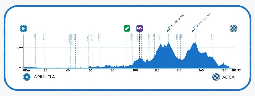 La localidad alicantina de Orihuela acogerá la salida oficial de la VCV 2023 el próximo 1 de febrero. Una primera etapa que finalizará en Altea tras casi 190 kilómetros de recorrido de media montaña, con pasos por los puertos de Coll de Rates y Bèrnia. Una primera oportunidad ya desde el inicio para los escaladores, los grandes favoritos a la victoria final gracias a la ausencia de contrarreloj individual o por equipos.