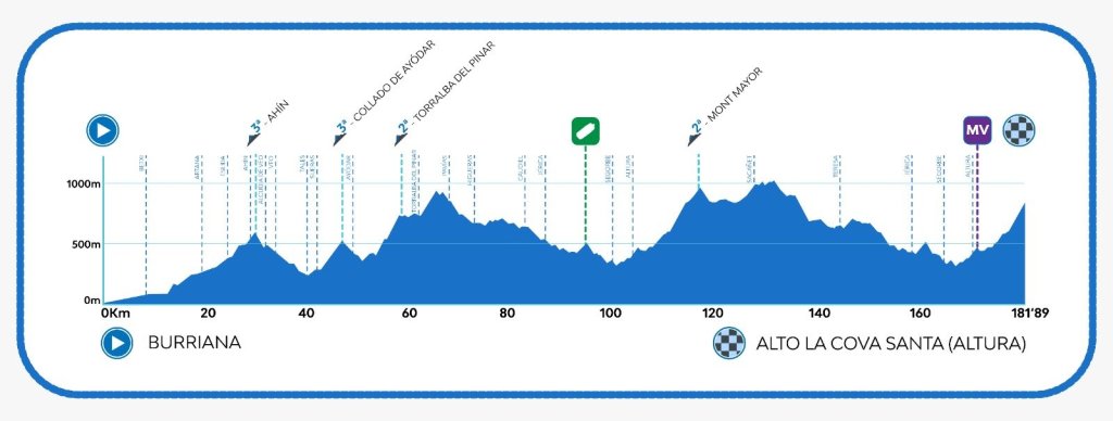La Etapa 4 de la VCV – Volta a la Comunitat Valenciana Gran Premi Banc Sabadell 2023, la etapa reina de esta edición, partirá desde Burriana y finalizará en Altura; con un recorrido íntegro por la provincia de Castellón. Atravesará algunas de las cimas más emblemáticas de la espectacular Sierra de Espadán y tendrá un final inédito frente al Santuario de la Cueva Santa. Una etapa con movimiento casi desde el inicio y poco tiempo para recuperar piernas. Quien quiera desafiar al líder de la general, tendrá en esta etapa una buena oportunidad para recortar diferencias.