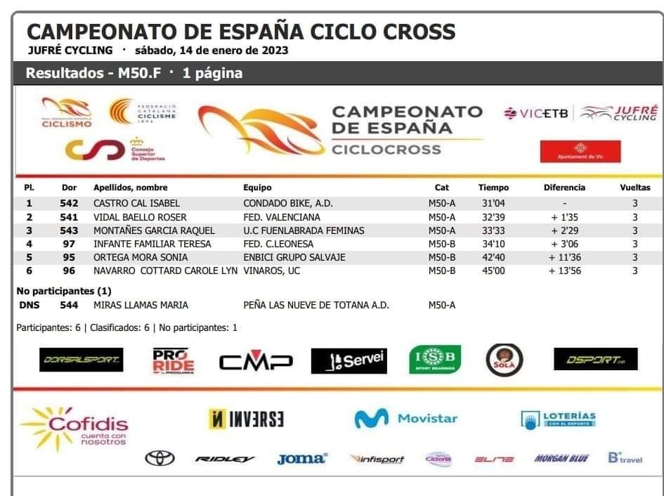 Grandes resultados de las féminas másters. Carolina Juárez se ha proclamado campeona en M30 y Roser Vidal termina segunda en M50A. Resaltar la medalla de bronce conseguida por Carole Navarro (UC Vinarocense) en