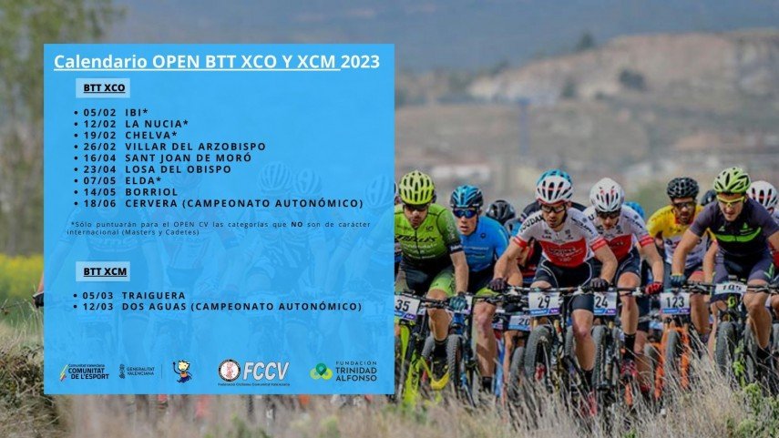 El Open BTT XCO y el XCM 2023 ya cuentan con su calendario diseñado para la presente temporada. El primero comenzará en Ibi el 5 de febrero y finalizará en Cervera, con motivo del Campeonato Autonomico, el 18 de julio. También habrá pruebas en La Nucía (12 de febrero), Chelva (19-02), Villar del Arzobispo (26-02), Sant Joan de Moró (16-04), Losa del Obispo (23-04), Elda (7-05) y Borriol (14-05).