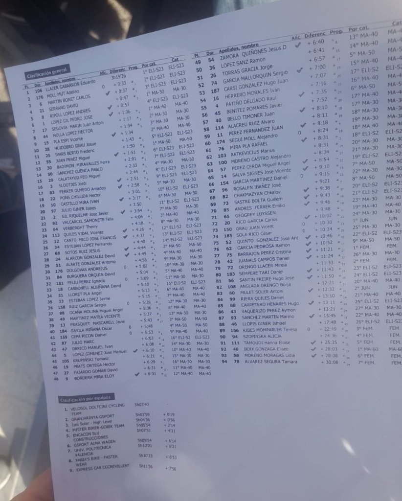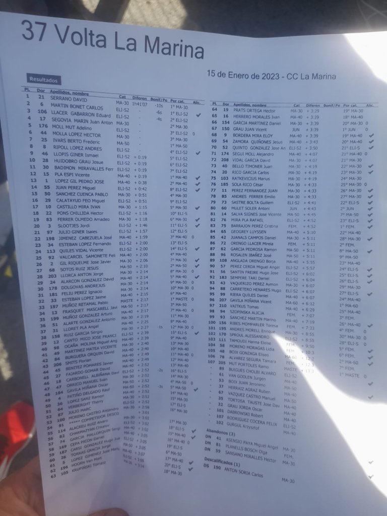 En la General, Eduardo Llacer es líder también en élite; Serrano, en M30; Pedro José López, en M40; Frédéric Ivars, en M50; Elíseo Boix, en M60; Vicent Grau, en júniors; y Cristina Barrajón, en féminas