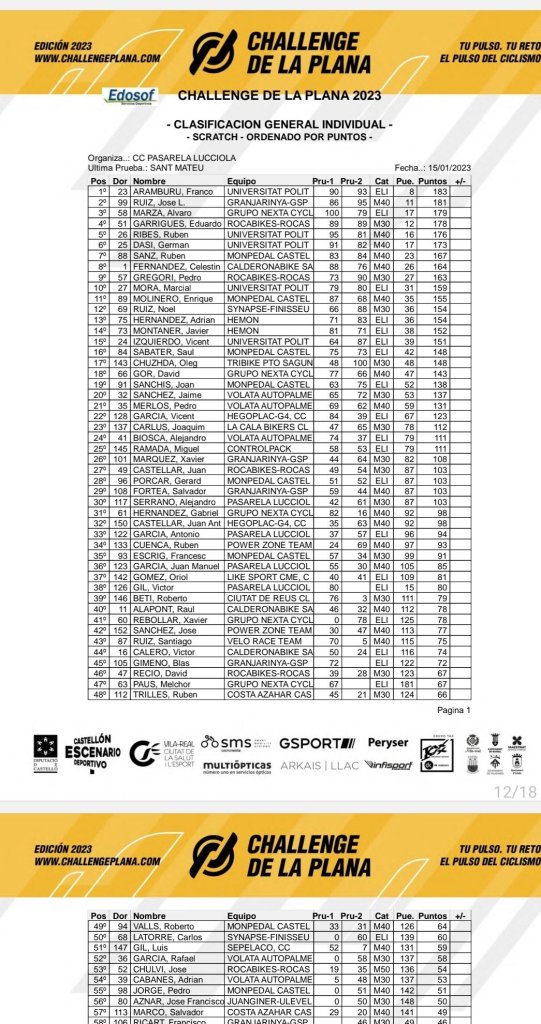 En la general, Aramburu es el primero también en élites; Eduardo Garrigues, en M30; José Luis Ruiz, en M40; José Chulvi, en M50; Francisco Ramos, en M60; Pepe Mas, en júniors; y Tania Martínez, en féminas. El UPV es el mejor equipo; Chuzha lidera la Montaña; y Oriol Gómez, las Metas Volantes.
