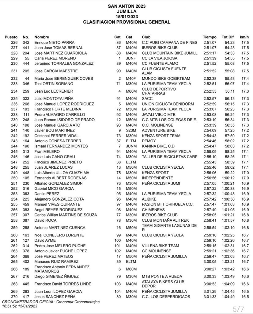 Sergi Arnau se ha impuesto en la categoría élite; Luis Martínez, en Sub 23, con Fernando Vilaplana, tercero; Pawel Bernas ha sido el mejor M30, con Víctor Sellés, tercero; Manuel Sánchez Aldeguer ha ganado en M40; Rafael Bolarín, en M50; José Antonio Segura, en M60; y Sergio Sánchez, en júniors.