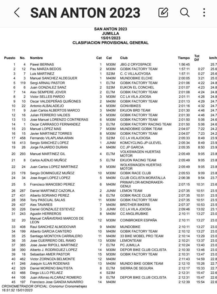 Pawel Bernas y Elena Lloret se han impuesto hoy en Jumilla en la XXX San Antón MTB 2023. Bernas ha estado acompañado en el podio por Pau Marzá y Luis Martínez. Lloret ha superado Arantxa Salvado.