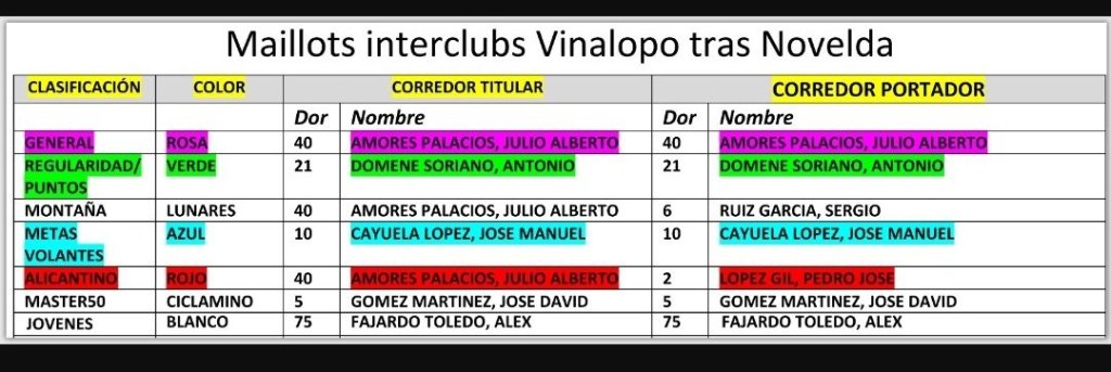 El orden por tanto de los maillots será el siguiente en la etapa de Elda del próximo sábado, tercera de la competición: Amores domina la general, la montaña y es el primer alicantino; Antonio Domene llevará el jersei de la Regularidad; José David Gómez, el de mejor M50 y Álex Fajardo, el de los jóvenes.