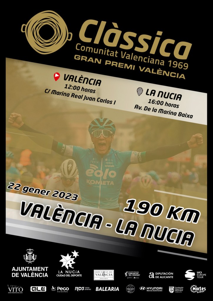 El municipio de La Nucía acoge hoy domingo 22 de enero la llegada a meta de la prueba ciclista ‘Clàssica Comunitat Valenciana 1969’, que vuelve a contar en esta 39 edición con el apoyo de la Diputación de Alicante. Un total de 19 equipos nacionales e internacionales, algunos de la máxima categoría, participarán en esta carrera, con la que se abre el calendario UCI en Europa. Se ponen el dorsal Eugenio Sánchez (Equipo Kern Pharma) y Pau Martí (Israel Premier Teach).