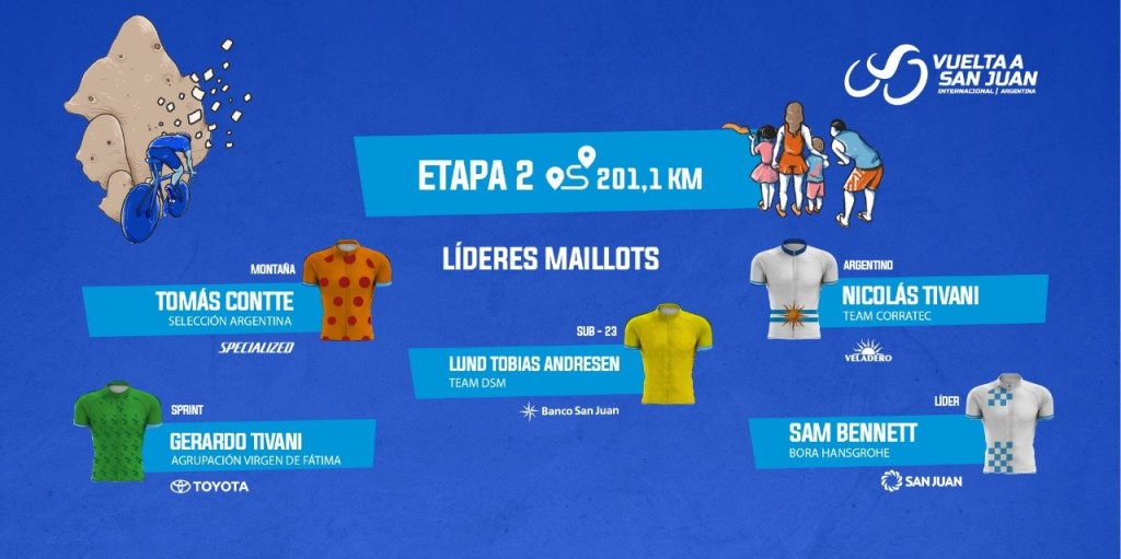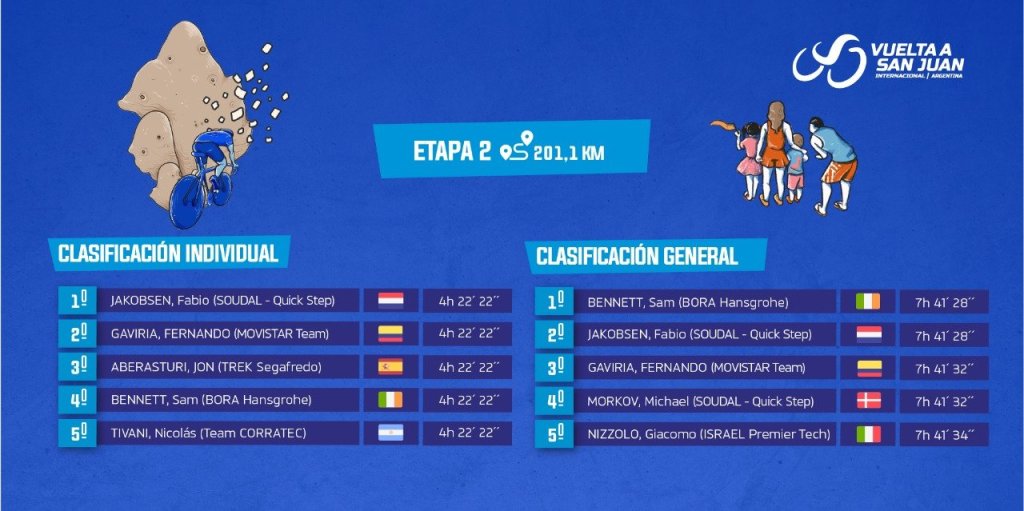 Fabio Jakobsen ganó al esprint la segunda etapa de la Vuelta a San Juan 2023 por delante del colombiano Fernando Gaviria y del español Jon Aberasturi, mientras que el irlandés Sam Bennett mantuvo el maillot albiceleste de líder. Puesto 16, segundo entre los jóvenes, de Iker Bonillo (Green Project Bardiani).