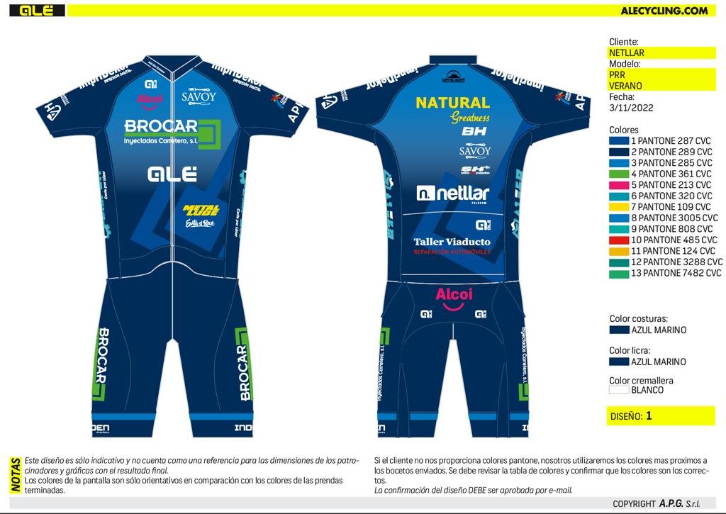 Los corredores ya comenzará a lucir el nuevo maillot que una vez más diseña la firma Ale´. Es muy semejante al de 2022, con las mangas del jersey un poco más azules, como el pantalón. La formación que dirige José Vicente Peidró y Andrés Antón, junto a Roque Lloret e Izán Linares, sigue teniendo el apoyo del Metal Lube y del Ayuntamiento de Alcoy como bases fundamentales para que el proyecto siga creciendo y dichas firmas aparecen en su jersey.