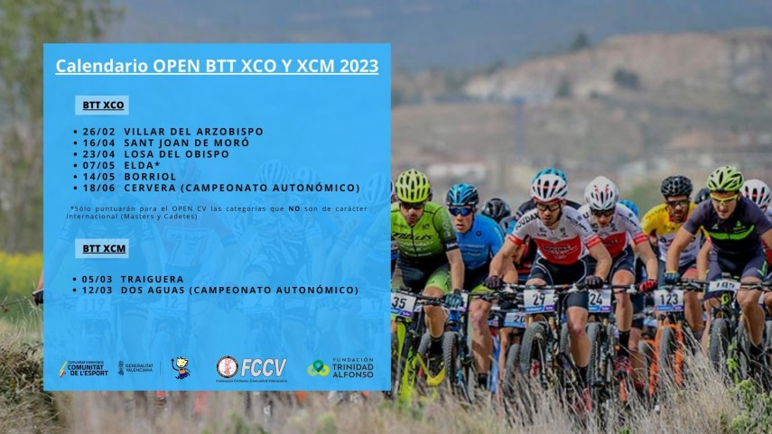 La Federación de Ciclismo de la Comunitat Valenciana ha anunciado la modificación del calendario del OPEN BTT XCO y XCM Comunitat Valenciana. El Torneo comenzará en Villar del Arzobispo el 26 de febrero y no en Ibi como en principio estaba previsto, y finalizará en Cervera, con motivo del Campeonato Autonomico, el 18 de julio. También habrá pruebas en Sant Joan de Moró (16-04), Losa del Obispo (23-04), Elda (7-05) y Borriol (14-05).