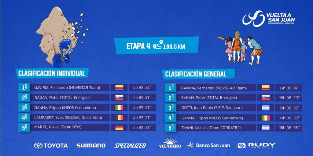 El colombiano Fernando Gaviria (Team Movistar) se impuso este miércoles en Barreal en la cuarta etapa de la Vuelta a San Juan, con un tiempo de 4 horas, 35 minutos y 37 segundos, y se convirtió en líder de la clasificación general. Puesto 69 para Iker Bonillo (Green Project Bardiani).