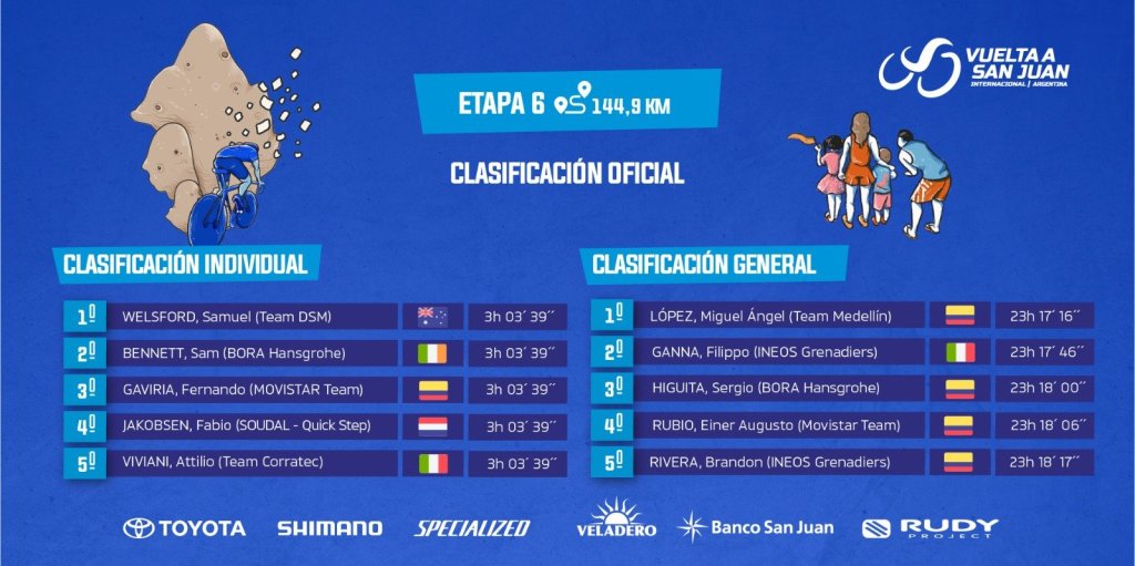 Sam Welford, del DSM Team, se quedó con la penúltima etapa de la Vuelta a San Juan, dejando a Sam Bennett en el segundo lugar y a Fernando Gaviria cerrando el podio. Bernal se retiró tras sufrir una caída. Puesto 17 para Iker Bonillo (Green Project Bardiani), de nuevo muy valiente en el esprint.
