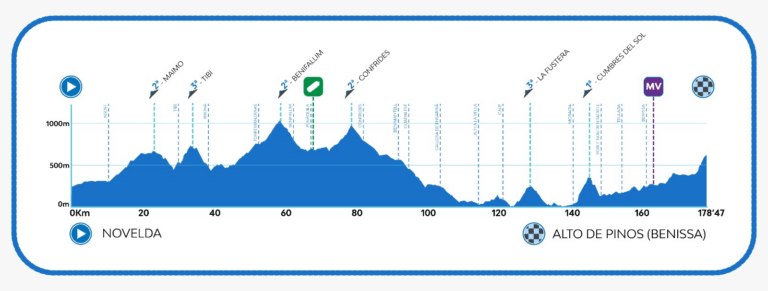 Gino Mäder (BHR), Mikel Landa (BHR), Marc Soler (UAE) y Wout Poels (BHR) han coronado en cabeza el puerto de Bernia, dejando un primer duelo Soler-Landa por el maillot de la montaña que puede ser interesante de cara a los próximos días de carrera. Los últimos kilómetros antes de llegar a la meta en Altea han sido de cierta calma, con algún amago de ataque siempre neutralizado por los equipos que apostaban por una llegada masiva al sprint. Solo el valenciano Joan Bou (EUS), motivado por correr en su tierra, ha consolidado una pequeña ventaja de en torno a los 10 segundos, pero a dos kilómetros de meta ha sido absorbido de nuevo por el pelotón.
