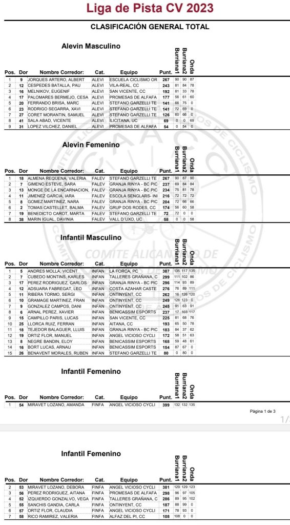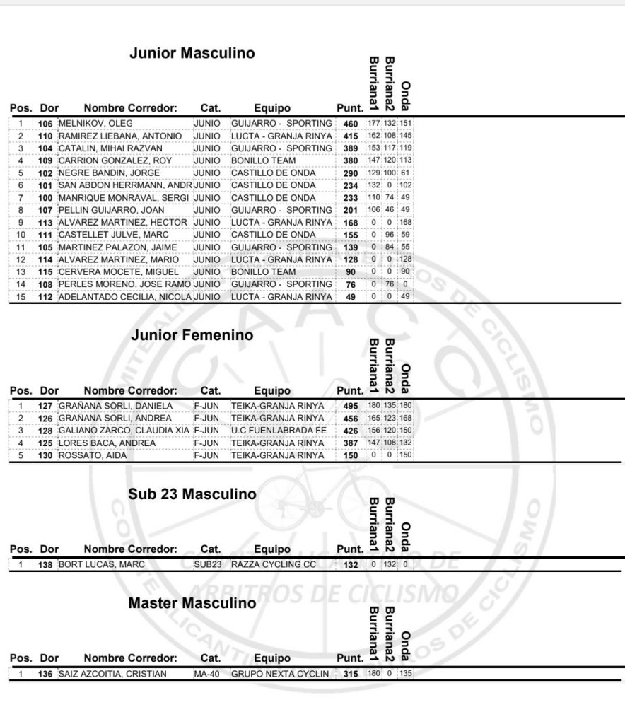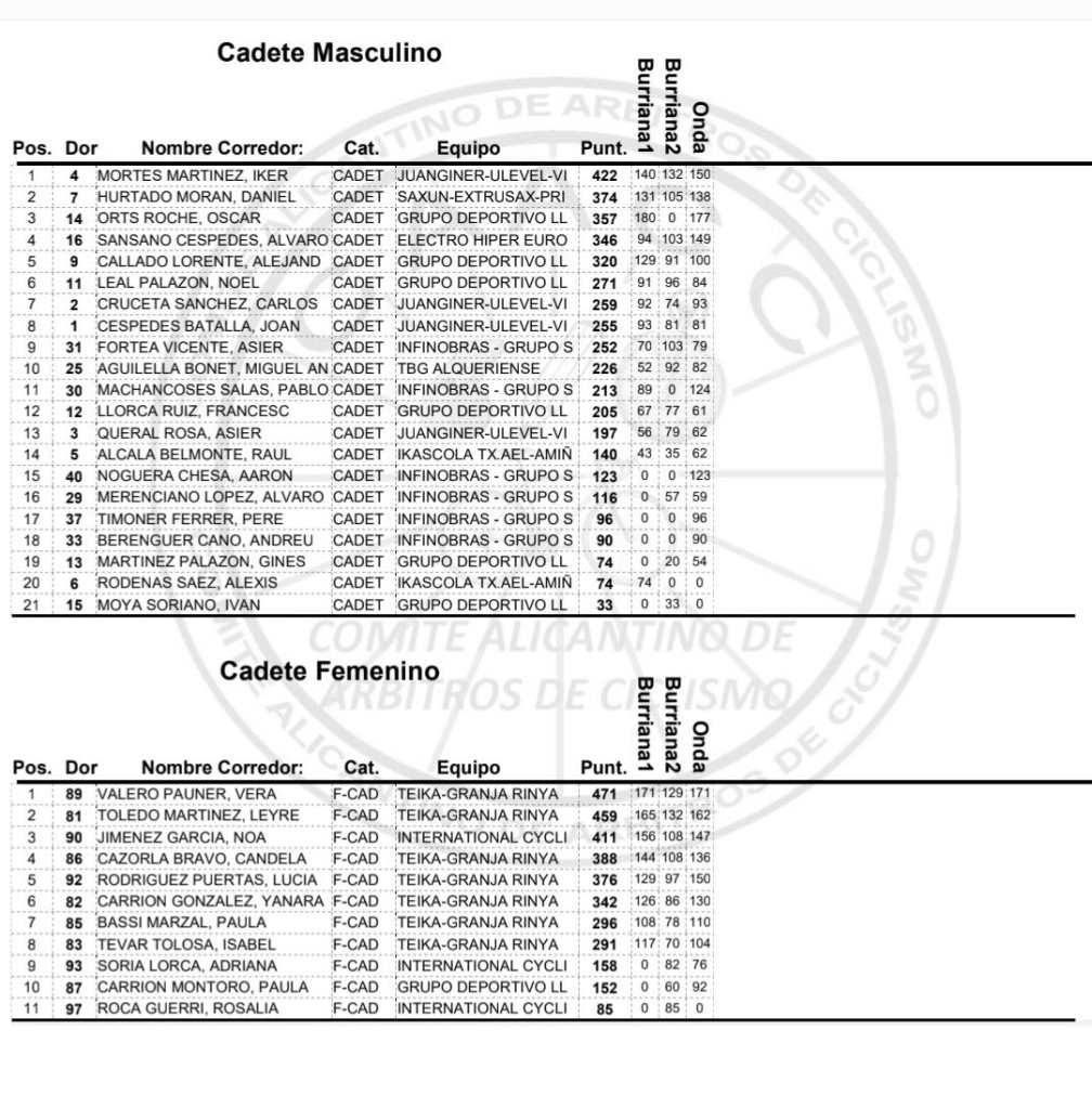A falta de una jornada para el final lideran la Liga Iker Mortes (JuanGiner) y Vera Valero (Teika-Granja Rinya), en cadetes; Oleg Melnikov (Guijarro) y Daniela Grañana (Teika-Granja Rinya), en júniors; Marc Bort (Razza Cycling), en Sub 23; y Cristian Sáiz (Grupo Nexta), en Máster. En la categoría de Escuelas, Albert Jorqués y Valeria Almena dominan en Alevines; y Vicent Andrés y Amanda Miravet, en Infantiles.