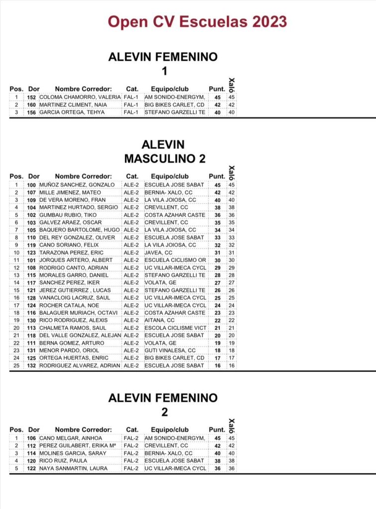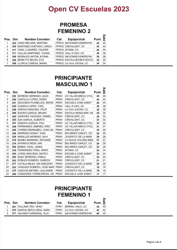 Hoy ha comenzado el OPEN BTT XCO DE ESCUELAS con la disputa del IV TROFEU BTT VILLA DE XALÓ, organizado por el CC Bernia-Xaló, con una participación de 203 de corredores. Los ganadores han sido: Guillem Verdú (La Vila Joiosa) e Iria Baquero (La Vila Joiosa), en Promesas 1; Alberto Martínez (ECV) y Martina Cano (AM Sonido), en Promesas 2; Álex Moreno (UC Villar) y Vera Fullana (Bernia Xaló), en Principiantes 1; Iker Hiraldo (José Sabater) y Claudia Casares (Vall d’Uixo), en Principiantes 2; Javier Delegido (José Sabater) y Valeria Coloma (AM Sonido), en Alevines 1; Gonzalo Muñoz (José Sabater) y Ainhoa Cano (AM Sonido), en Alevines 2; Álex Beltrán (Grup Dos Rodes) y Lara Lledó (Bernia Xaló), en Infantile 1; Pablo Picazo (José Sabater) y María Ivars (Bernia Xaló), en Infantiles 2.