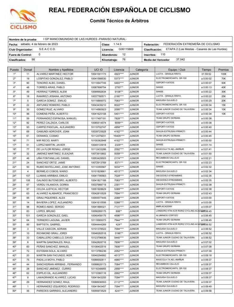 Héctor Álvarez (Lucta-Grupo Sime) ha logrado el triunfo en la segunda y última etapa del Gran Premio de Ciclismo Mancomunidad Comarca de Las Hurdes Paraíso Natural que ha unido Las Mestas y Casares de las Hurdes, de 76,1 kilómetros de recorrido. De esta manera, el benidormense se adjudica su primera vuelta de la categoría júnior, en la que ha estrenado este fin de semana. Un inicio fantástico.