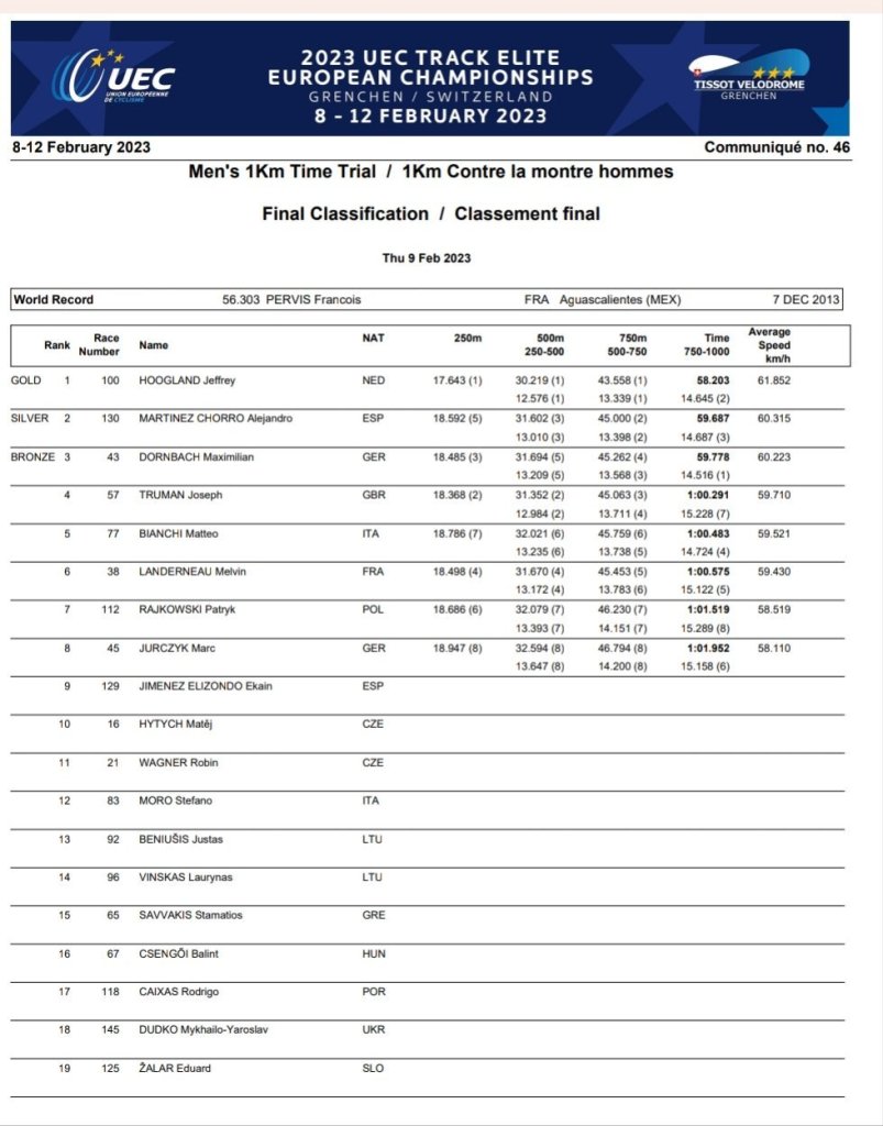 Alejandro Martínez se ha proclamado subcampeón de Europa en el Kilómetro CRI en el velódromo de Grenchen. El francés Jeffrey Hoogland ha sido el ganador y el alemán Maximiliam Dornbach ha completado el podio. El velocista alicantino se hace con la medalla de plata tras marcar un crono de 59″687. Se clasificó para la final tras hacer su mejor marca personal: 59″501. De esta manera batía el récord de España que estableció en el Mundial de Saint-Quentin-en-Yvelines (59.871).