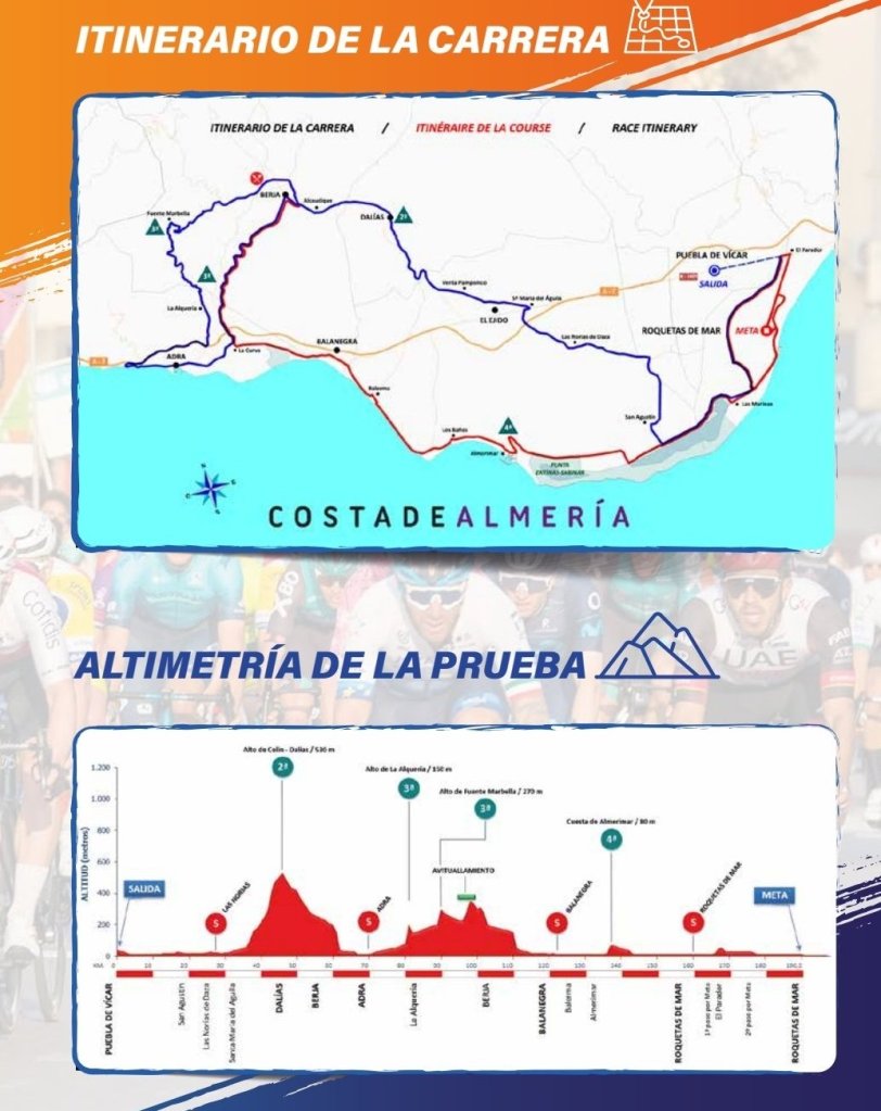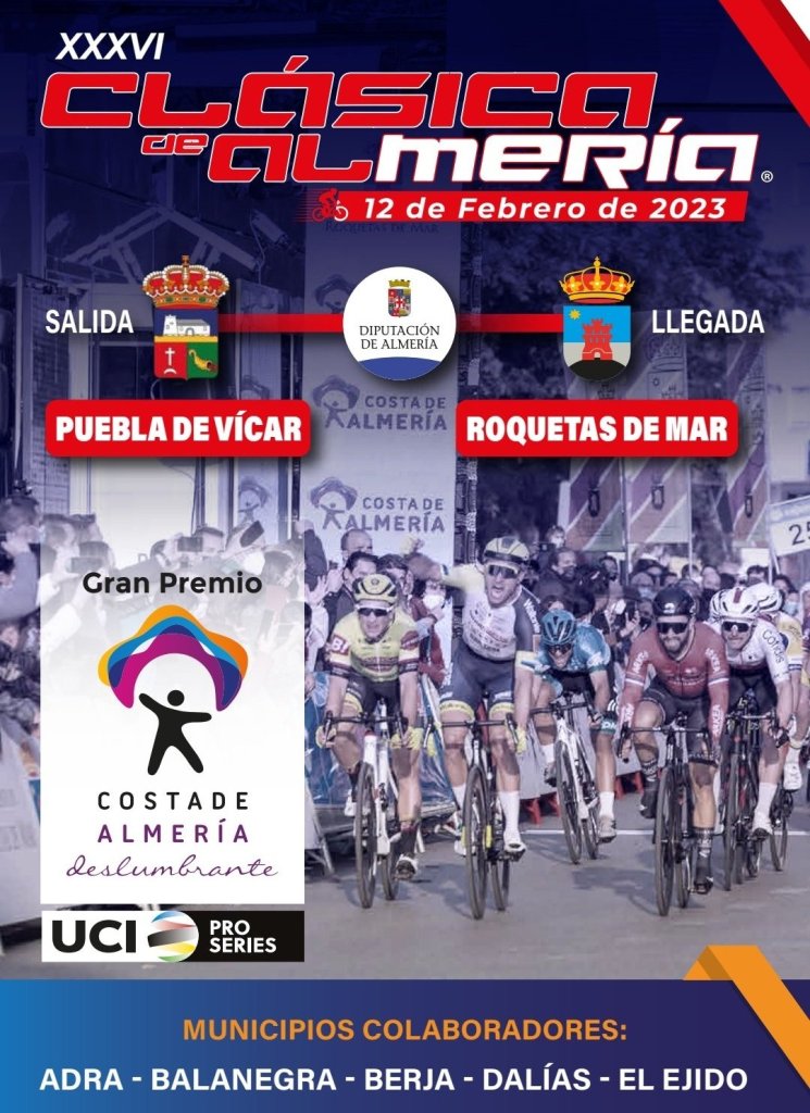 Un día después, llega la Clásica de Almería, que mantiene su tradicional final en Roquetas de Mar, donde suele decidirse la carrera en un sprint masivo del pelotón. En esta ocasión se recorrerán 190 kilómetros con salida en la Puebla de Vícar. Los corredores deberán superar cuatro ascensos puntuables que por su lejanía a la meta no suelen romper la carrera. Oportunidad de triunfo para Peñalver.