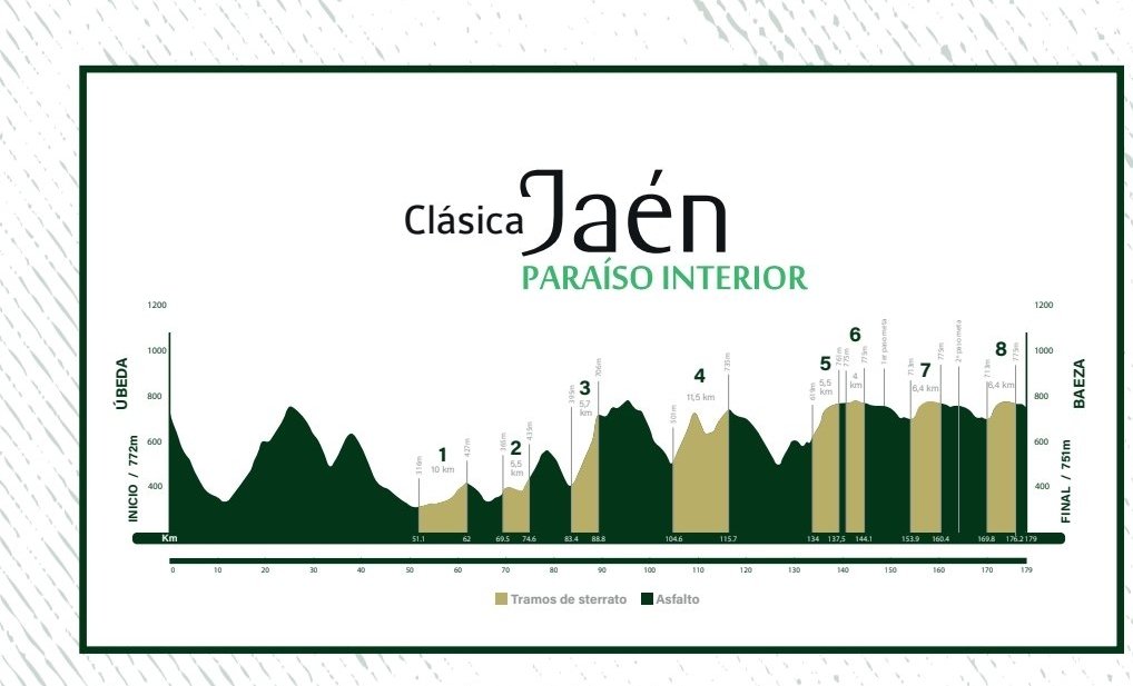 Este enlazado de pruebas entre Murcia y Andalucía lo completa el lunes 13 la Clásica de Jaén. Esta peculiar prueba que nació en 2022, cuenta con un aliciente poco habitual en el ciclismo de carretera: los tramos de tierra. De los 179 kilómetros de prueba, 48 se recorrerán sobre el conocido como ‘sterrato’, repartidos en ocho sectores.
