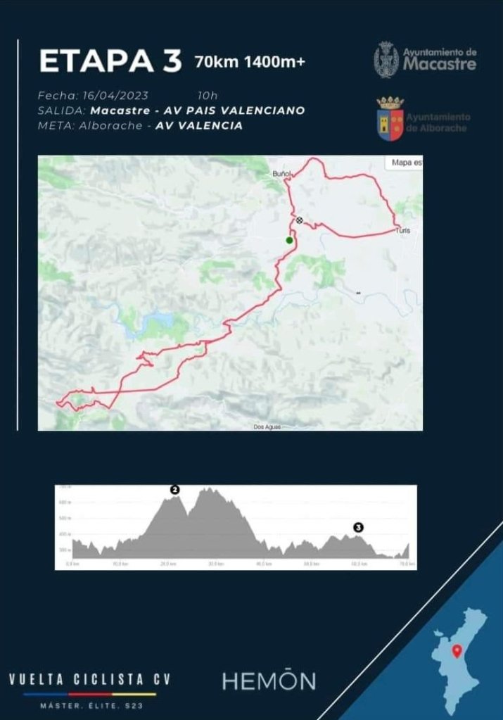 Ya, el 16, tendrá lugar la tercera y última jornada entre Macastre y Alborache. Serán 70 kilómetros de recorrido. El pelotón partirá a las 10 horas. La prueba está organizada por Hemon CC. El próximo martes apertura de inscripciones : www.vueltaciclistacv.com