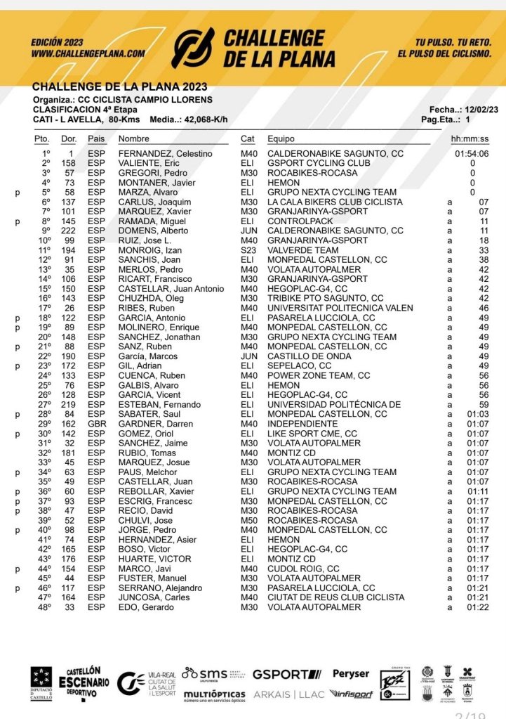 Celestino Fernández (Calderonabike) se ha impuesto hoy en Catí en la cuarta jornada de la Challenge de la Plana que ha contado con 70 kilómetros de recorrido. Eric Valiente (Gsport) ha terminado segundo y Pedro Gregori (Rocabikes) ha completado el podio. Álvaro Marza, quinto hoy, sigue de líder. Valiente ha sido el primer Élite; Izán Monroig (Valverde Team) ha ganado en Sub 23; Joaquím Carlus (La Cala), en M30; Celestino Fernández, en M40; José Chulvi (Rocabikes),en M50; y Alberto Domené (Calderonabike). Celestino Fernández se llevó el premio de la montaña; Vicent Izquierdo, las metas volantes. El Granja Rinya ha sido el mejor equipo.
