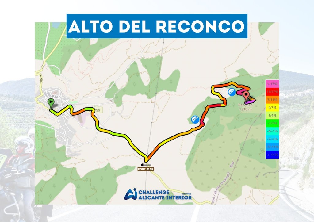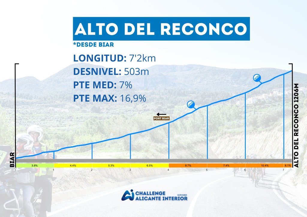 Una subida de 7’8 kilómetros que se puede dividir en dos partes: la primera, hasta el puerto de Biar, y la segunda, tras el desvío, que es donde realmente empieza la dureza de este puerto con rampas del 17% y los últimos dos cercanos al 10% de pendiente media.