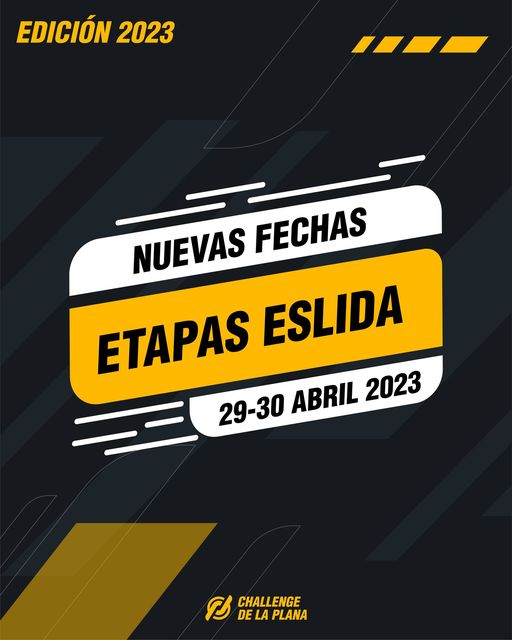 La organización de la Challenge de la Plana informa que debido a causas ajenas a ellos «nos vemos obligados a cambiar las fechas de las dos últimas etapas de Eslida previstas para el 25 y 26 de febrero» y se disputarán los días 29 y 30 de abril de 2023. Todas las clasificaciones finalizarán en la última etapa de Eslida. Los participantes que contrataron el seguro de cancelación podrán solicitar el abono proporcional de la inscripción de estas dos etapas. «Somos conscientes de los inconvenientes que esto puede suponer y de antemano os pedimos disculpas», apuntan desde la organización.