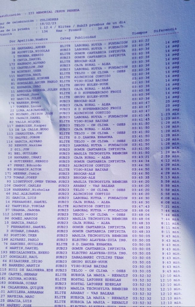 Ander Ganzabal (Laboral Kutxa) logra el triunfo en el III Memorial Jesús Pereda disputado hoy en Colindres. Su compañero de escuadra Nicolás Alustiza ha sido segundo y Sergio Trueba (Gomur) ha completado el podio de la prueba cántabra. Álvaro Sagrado (Brocar Alé) ha terminado quinto e Izán Linares ha debutado como director del equipo de la Fundación Benicadell.