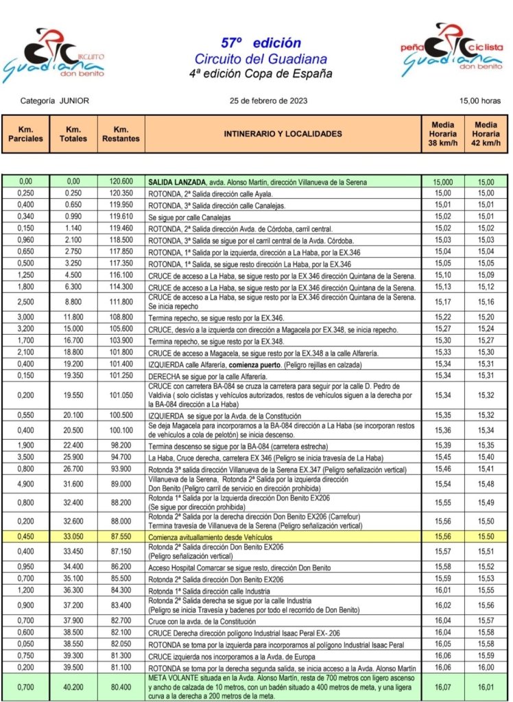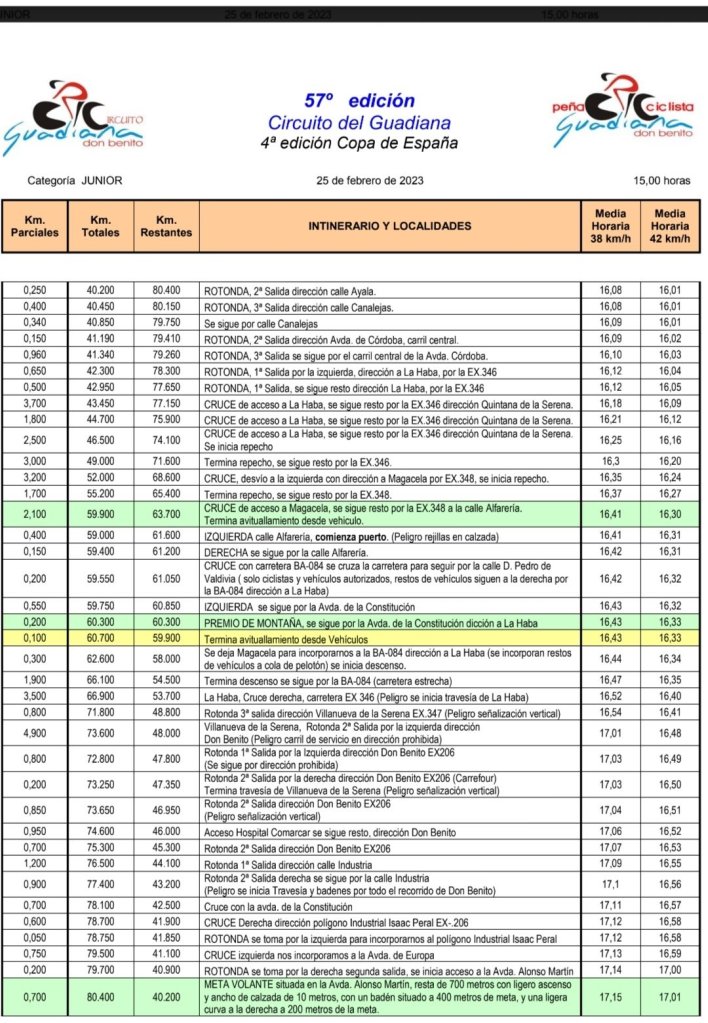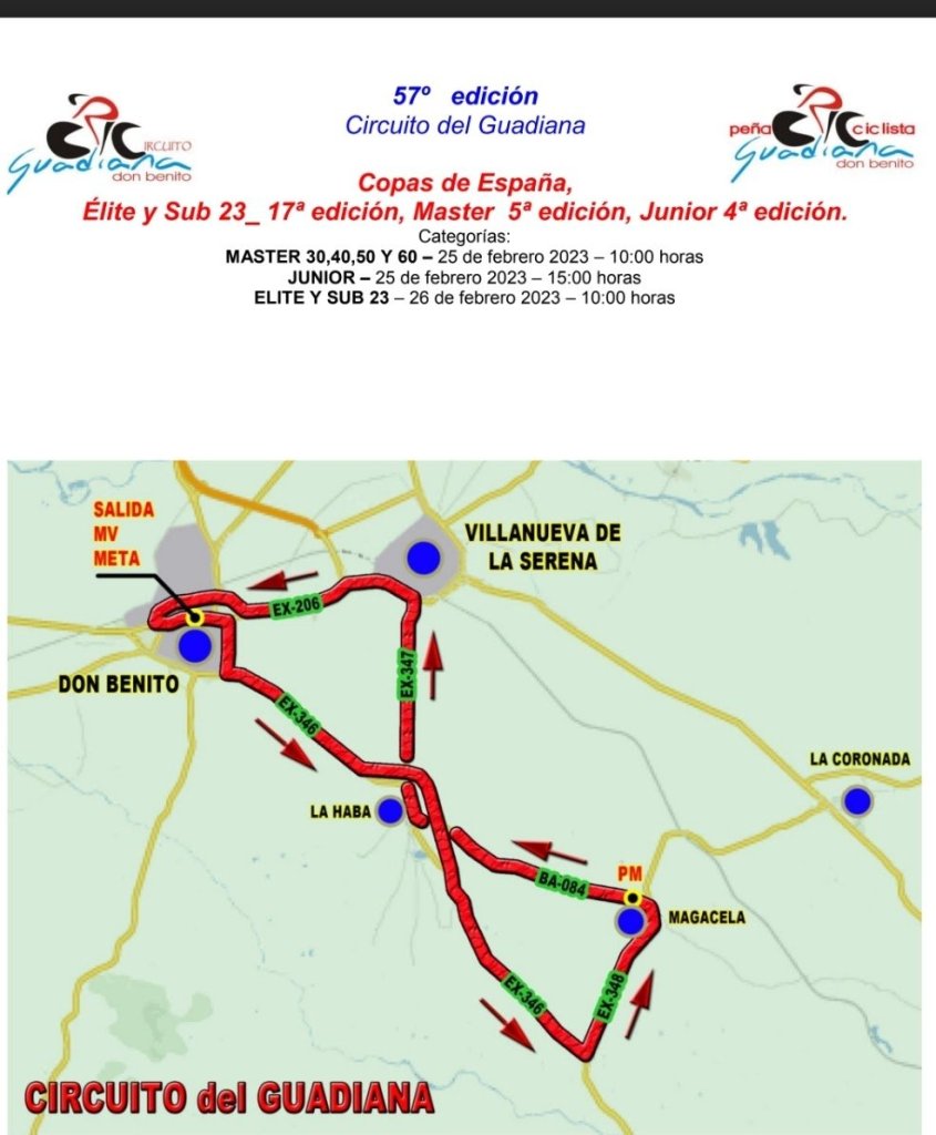 Este Circuito Guadiana para la categoría junior dará comienzo el sábado 25 de febrero a las 15:00 horas. En total, el pelotón junior tendrá que afrontar 3 vueltas al circuito de 40 kilómetros que vertebra, año tras año, la prueba dombenitense para completar un total de 120 km. El punto clave de esta 57ª edición del Circuito Guadiana volverá a ser la subida a Magacela, la cual se ascenderá en tres ocasiones y donde a buen seguro veremos romperse el pelotón debido a la dureza de sus rampas. Recordemos que es un ascenso de poco más de un kilómetro, pero con una pendiente del 11% que inevitable establecerá diferencias y seleccionará a los más fuertes de la carrera. Está previsto que la llegada a meta de esta prueba de la categoría junior se produzca alrededor de las 18:30 h.