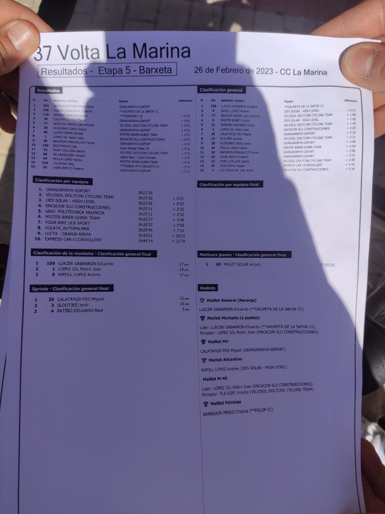 Óscar Hernández (Granja Rinya)ha ganado en Barxeta la quinta jornada de la XXXVII Volta La Marina que ha contado con 74 kilómetros de recorrido. Edu Llacer (Grupeta de La Safor), segundo, se viste de líder. Adrián Aranda (Triasport) ha completado el podio de la jornada.