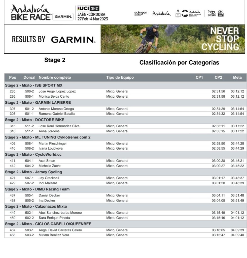 Por detrás suyo se ha formado un grupo perseguidor que ha rodado junto durante toda la etapa. La nieve y el hielo acumulados en la cima de El Pincho han provocado que los corredores tuvieran que ser cuidadosos en el descenso. Tiago Ferreira y Andreas Miltiadis (DMT-Blackjack) quienes han conseguido una segunda posición, han liderado este grupo hasta meta, llegando a más de 2 minutos de los ganadores de la etapa, seguidos de los italianos Francesco Failli y Riccardo Chiarini (Taddei Factory Team) que han completado el podio. Por su parte Michal Paluta y Pawel Bernas (JBG2 Team), ganadores de la primera etapa y actuales líderes, mantienen el cosechado maillot de la general.