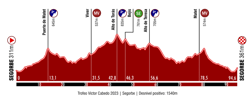 La localidad de Onda volverá a ser el punto de salida del Trofeo Víctor Cabedo en su edición 2023, el próximo sábado 4 de marzo. Un terreno siempre quebrado y un total de 80 kilómetros antes del empinado final con la subida al Castillo para definir al primer líder de la competición. Serán dos vueltas en dirección norte por el embalse de Sichar que proponen una carretera con varios repechos para ver los intentos de fuga y que en los dos pasos por Onda disputarán senda metas volantes (kilómetro 28,2 y 56,7) así como un esprint especial en Ribesalbes (kilómetro 37’5) en la segunda vuelta. A partir de ahí, comienza el tramo decisivo que encadena la subida a Collado de Ayódar, de segunda categoría, con casi 7 kilómetros de subida que solo darán respiro momentáneo dentro del kilómetro final; y un rápido descenso hacia Onda antes de la subida al Castillo.