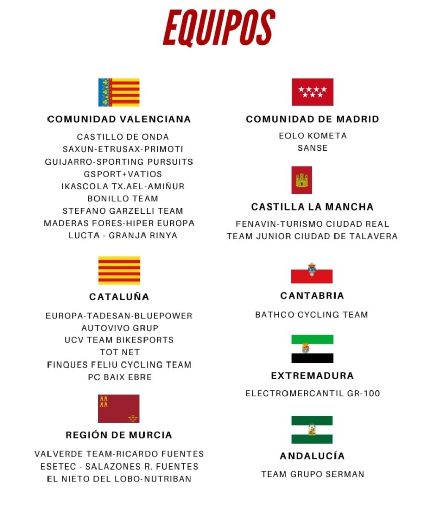 Completan la lista de escuadras participantes los tres conjuntos murcianos Valverde Team-Ricardo Fuentes y El Nieto del Lobo-Nutriban, además del Electromercantil GR100 extremeño; el Grupo Serman andaluz; y los dos conjuntos manchegos del Fenavin-Turismo Ciudad Real y el Ciudad de Talavera.