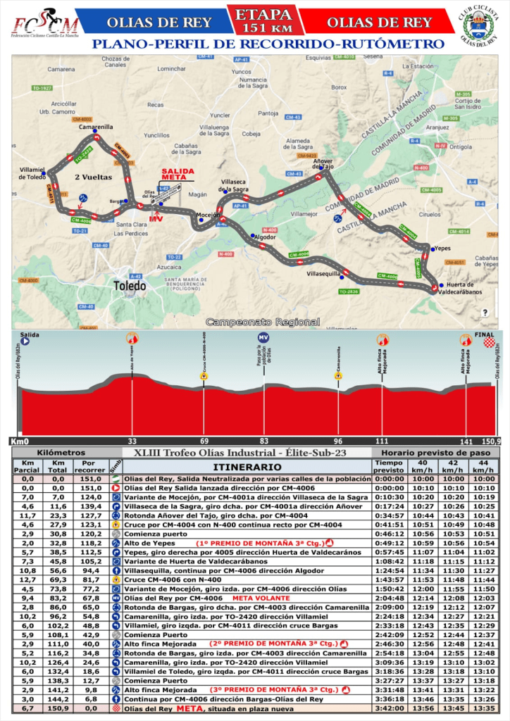 Para la edición 2023, el Club Ciclista Olías del Rey ha diseñado un recorrido totalmente renovado con la finalidad de hacer más atractivos y novedosos los 150 kilómetros de la carrera. Se abandona el tradicional circuito al que se daban cuatro vueltas y se transforma en un bucle con dos partes diferenciadas. La prueba arrancará desde Olías del Rey a las 10 de la mañana y completará el nuevo trazado, mejorado y con un poco más de subida, con paso por Mocejón, Villaseca, Añover, Yepes, Huerta de Valdecarábanos, Villasequilla, Bargas, Camarenilla, Villamiel… El circuito incluye subidas puntuables al Alto de Yepes (km. 32,8) y al Alto Finca Mejorada (km 111 y 141,2) y una meta volante que se disputará en las calles de Olías del Rey.
